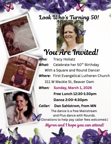 Flyers Dance Events and Cruises Tracy Hollatz Birthday DanceSunday, March 1, 2026Beaver Dam, WI Minnesota Shenanigans Plus WeekendMarch 27-28, 2026 Germany SD-Extended Advanced and ChallengeApril 10-12, 2026 Chula Vista ResortPlus WeekendMay 29-31, 2026 Hassda FestivalEmporia, KansasJuly 10-11, 2026 Germany & Austria Square Dance TourSept. 15-29, 2026